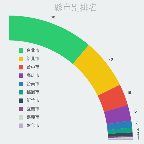 縮小範圍來到了地區別排名,前兩名是台北的蛋黃區之一的大同區與大安區,雖然身處租金不便宜的台北市心臟地帶,但方便的交通受到攝影棚棚主們的青睞,在此區的攝影棚以適合商業攝影的實景棚最多,也有部分大小型白棚式攝影棚,為商業區的攝影相關從業人員提供了多樣的選擇。