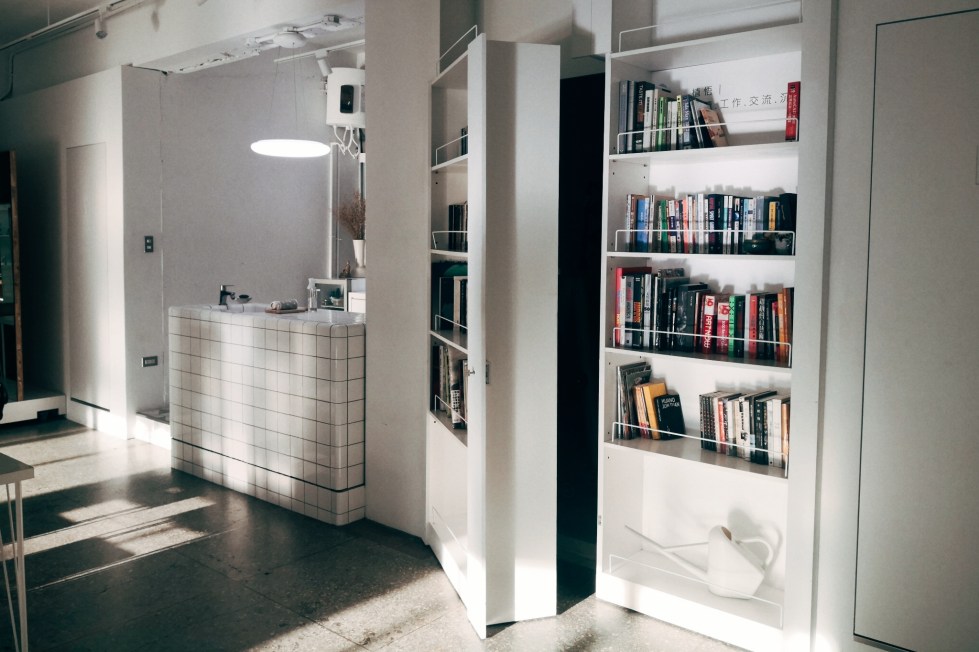 雲母的整體空間設計走簡約風格,從別具質感的門口、招牌,一直進到室內後,整體空間的基調是以白色搭配上大地色系與綠色植物點綴,營造出舒適悠閒的空間。天保本身也有做過攝影棚的空間設計案,大多是公司附屬的攝影棚,空間的利用與設計都比較固定。在雲母他便發揮自己的想法,像是牆面的部分有不少地方都故意不加以修飾,用裸露原始材料的方式展現出樸拙感,牆柱也有一小部分保留了原先壁紙的痕跡,大膽的呈現方式更能保留老屋韻味。另外收納空間也有許多巧思,像是廁所後方的空間一拉開滑門,就是放置桌椅的儲藏空間,書櫃拉開後也是一個儲物空間,對於道具時常需要擺出收入的場地來說,在設計時優先考量儲物空間是非常重要的一點。