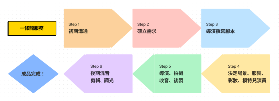 所謂一條龍客製化服務流程指的是:初期溝通–>確立需求–>導演撰寫腳本–>決定場景、服裝、彩妝、模特兒或演員–>導演、收音、後製–>後期混音、剪輯、調光。