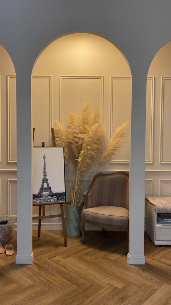 簡約歐風場景,不時可見拱門造型置身其中,背景牆多為白色線板造型經典百搭,其他道具還有人台及古董櫃,好歐位於文山區窗外小露台風景十分怡人。
