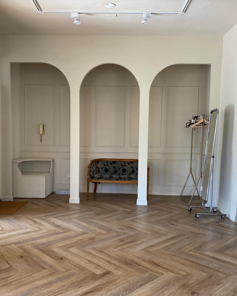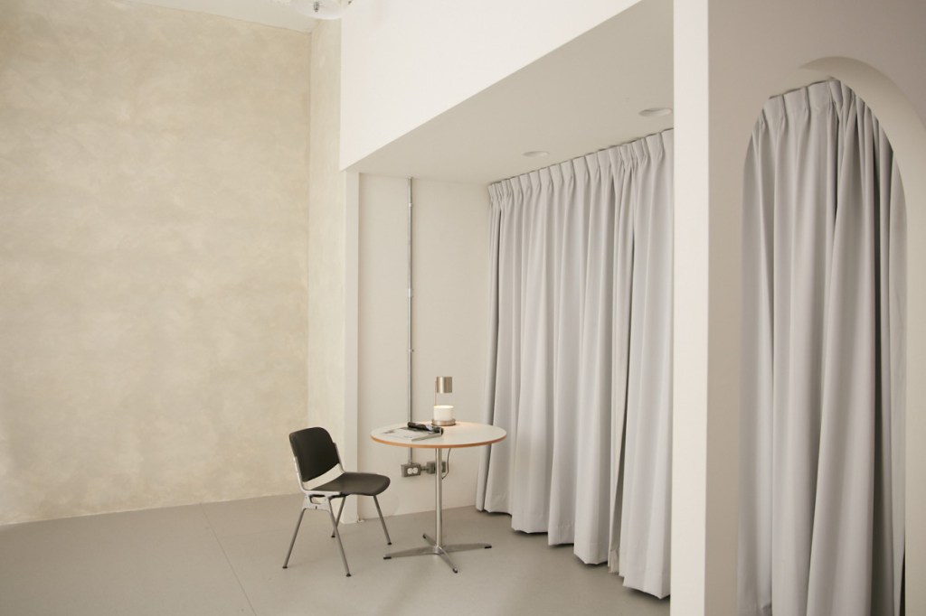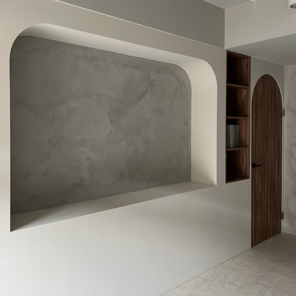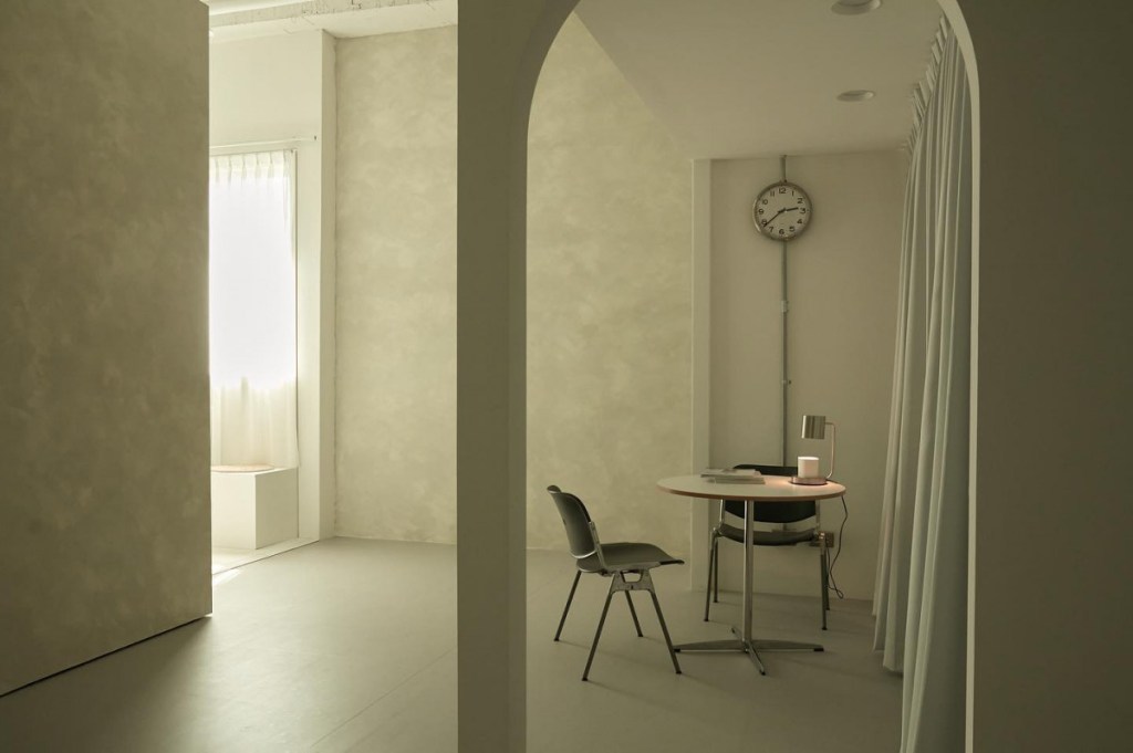 以水泥灰為主色週的Clay studio,充滿時尚冷冽風格,場內備有拱門造型牆,搭配胡桃深拱門,營造出對比強烈的棚景,另有單人床及人台可供使用。