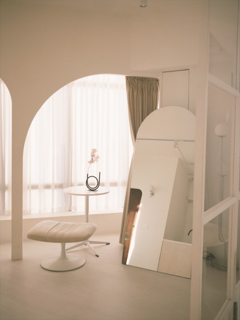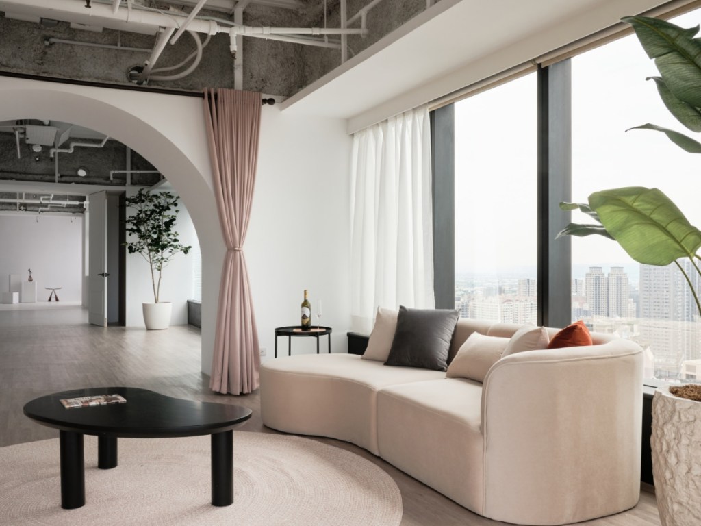 可眺望台中夜景的光嶼之間,屬於文青型棚景,裝潢隨處可見拱門設計巧思,高樓層並配置大面積落地窗,營造出寬闊穿透的空間格局,家具家飾均選搭極簡風格,完美演譯Less is more風格。