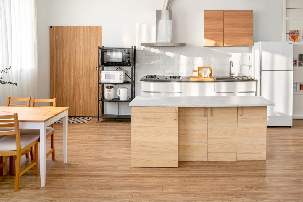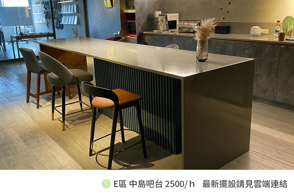 中島吧台:高腳椅、流理台、層板、微波爐、冰箱、咖啡機(電子產品僅供擺飾不提供使用)。