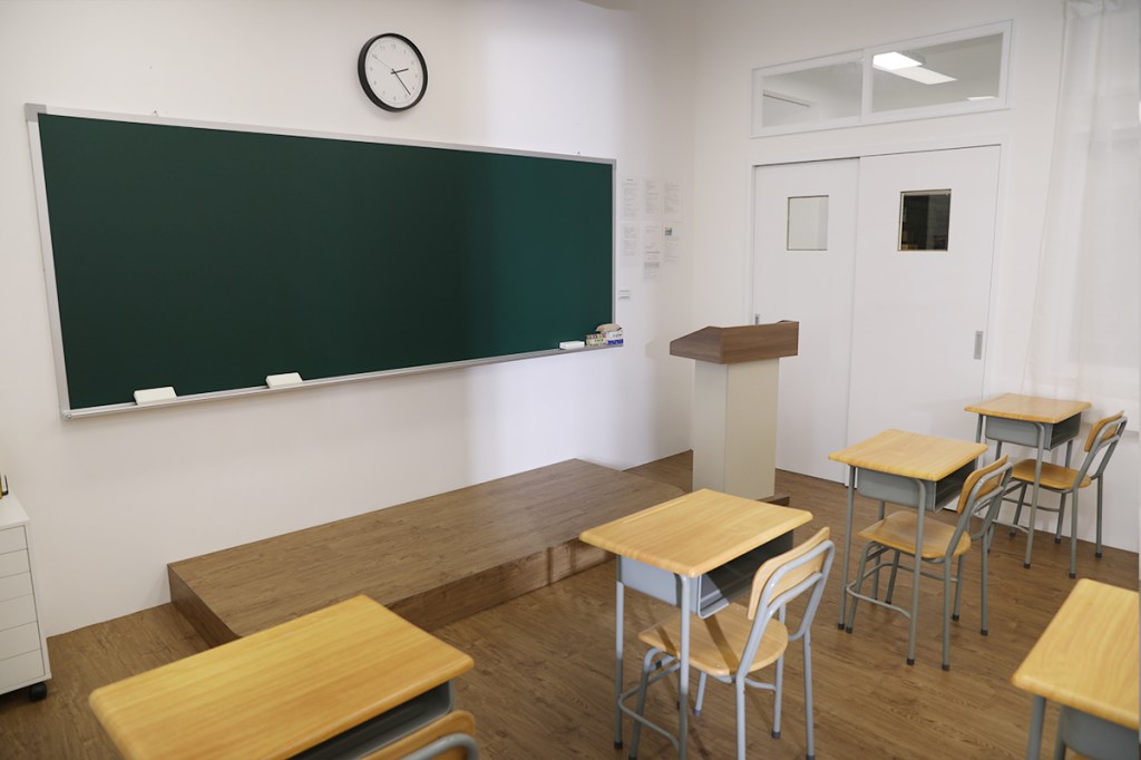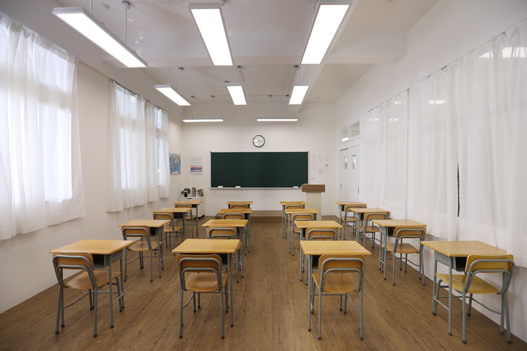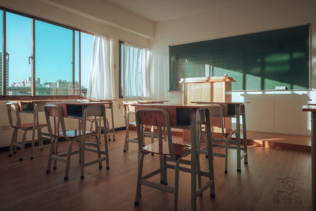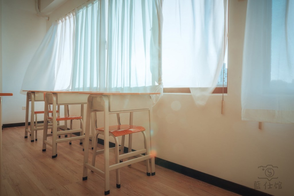 自帶市景的教室棚,有講師台、黑板、課桌椅,還有對外窗可欣賞市景及夜景,藍仕館還提供居家、廚房植光棚,場景多元且不定時更新棚景。