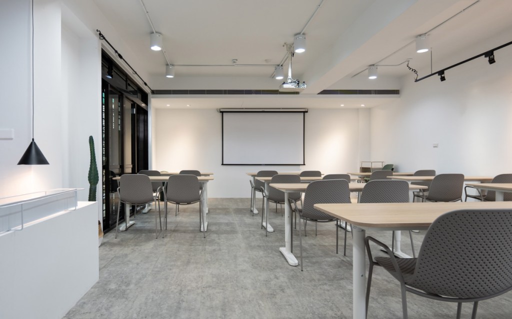 簡約灰色系教室場景,同時也適用於會議、講座、直播,設有投影機及布幕,屬於多用途功能攝影棚。