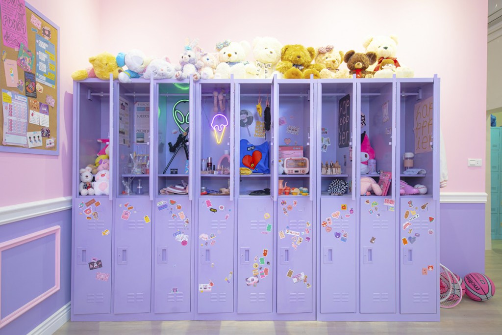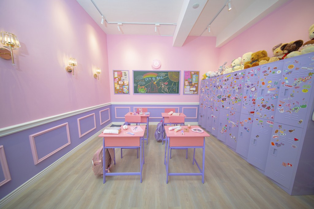 Photo at主推韓風實景棚,全室近50坪挑高3.4米,擁有粉紫色夢幻教室棚,配有同色置物櫃,完全復刻韓團MV場景,另有弘大便利店、彩虹淋浴間、奶茶色天台,根本為校園偶像劇而生。