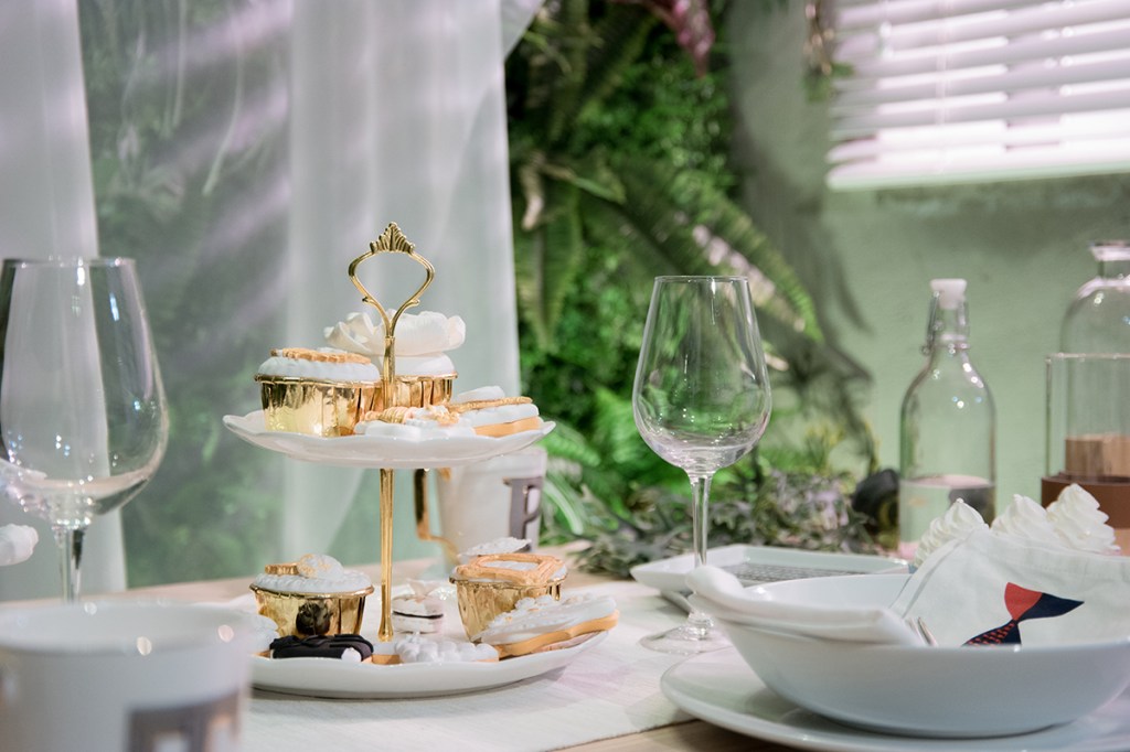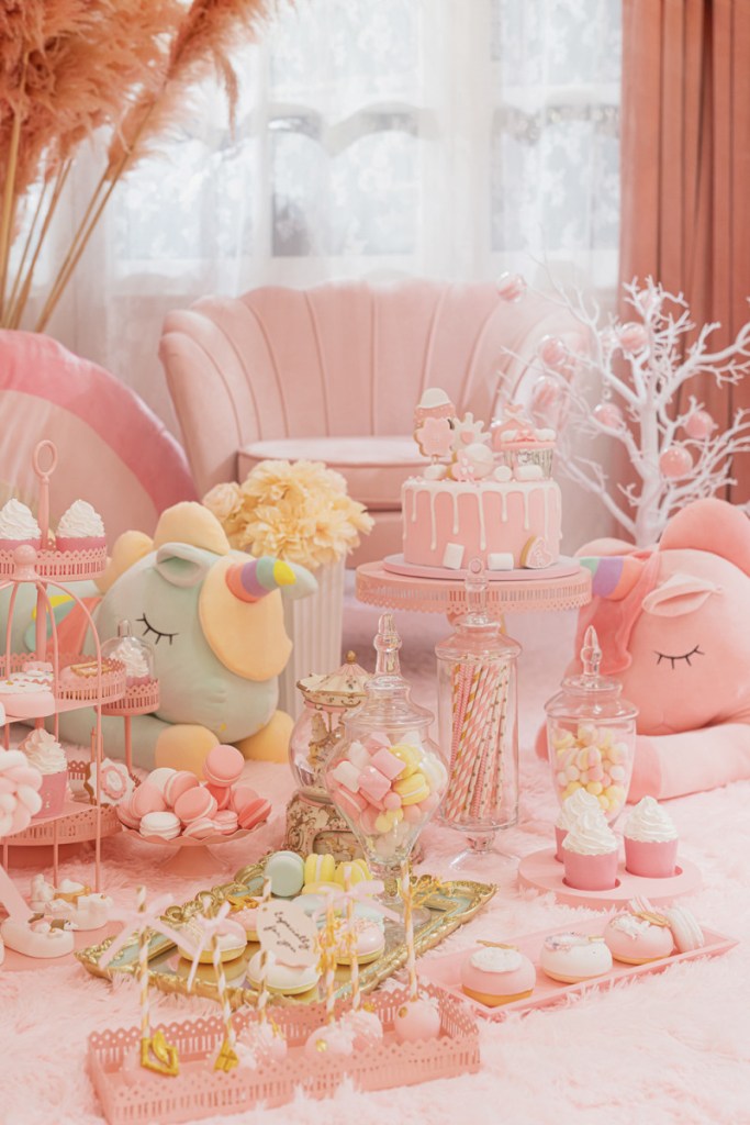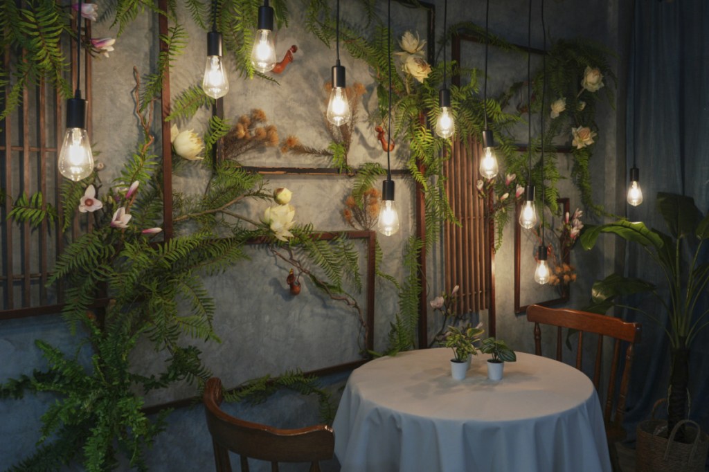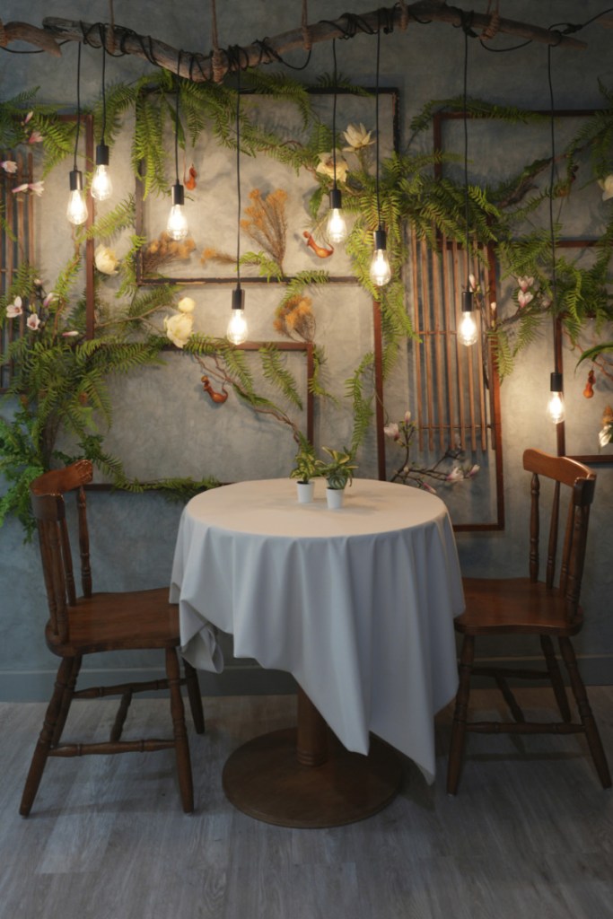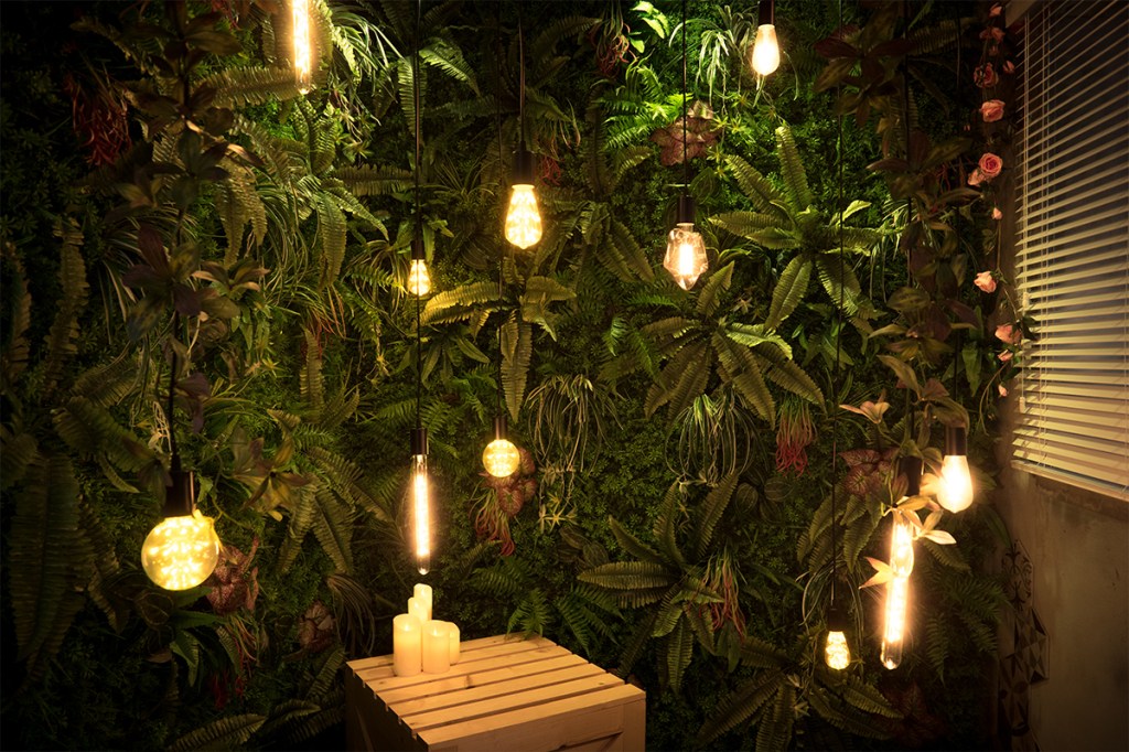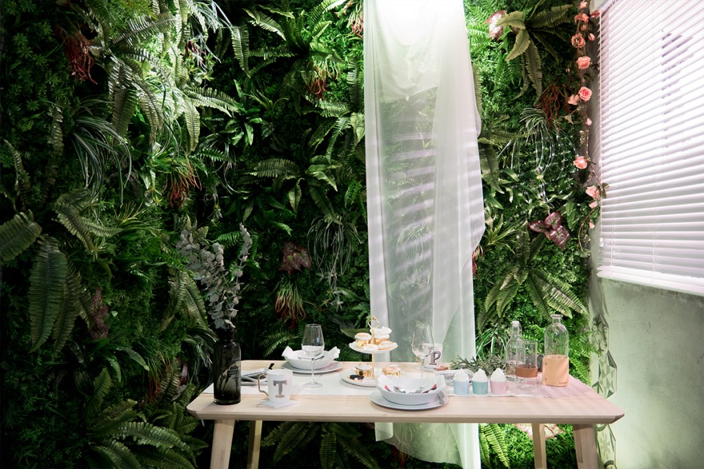 全開放35坪空間,單次僅服務一組客人,清新簡約的家景經典百搭,另有仿生植物牆,掛滿燈泡時充滿異國情調,佈置成下午茶場景,又好像走進愛麗絲的童話仙境。