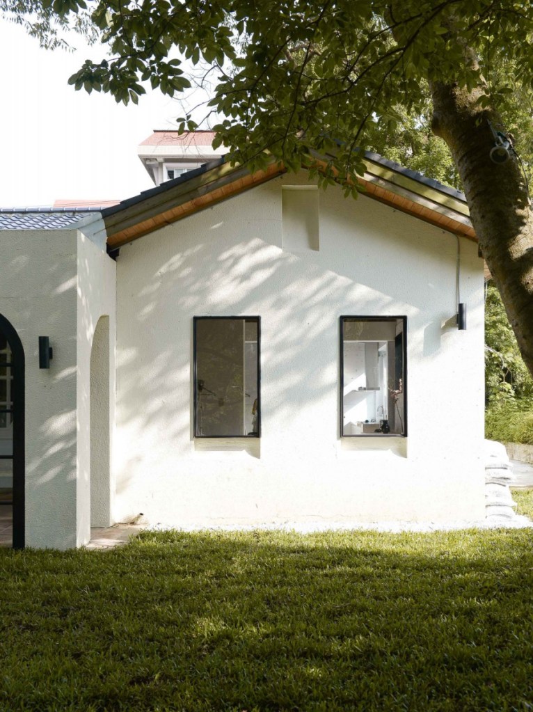 超質感韓風別墅,景觀庭院內有百年樟樹,各區屋頂皆有天井引入日光,無論室內、室外,每個角落都是戲,陽光從天井灑落到起居室的光影,搭配草綠色歐式木門美到升天。