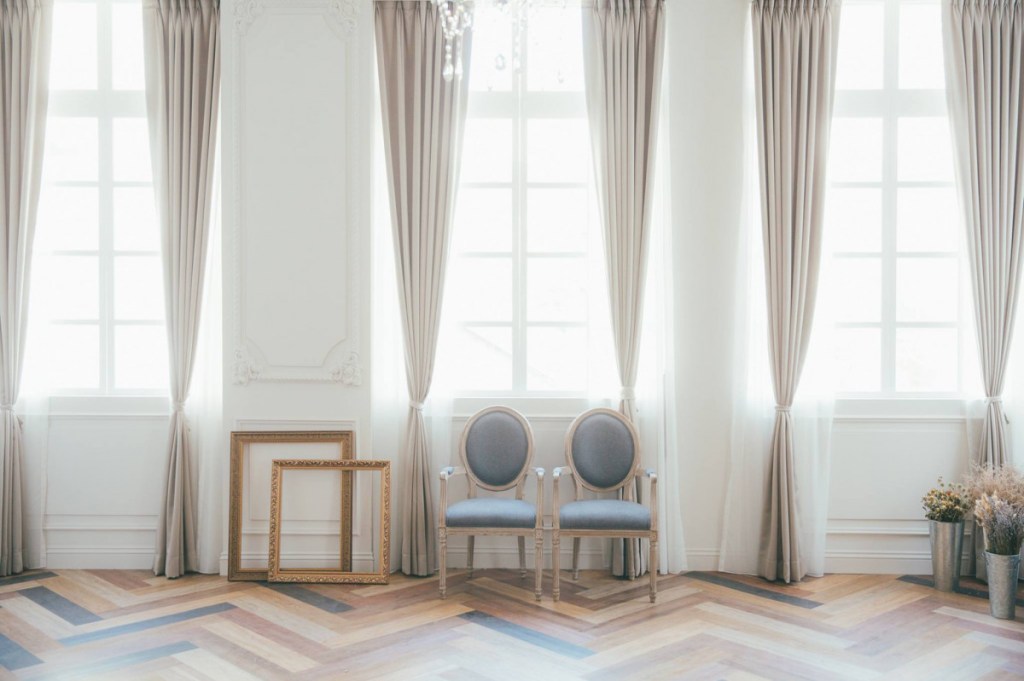 佔地180坪挑高3.8米,棚景不斷更新中,從韓風到Zakka任君挑選,人氣王美式房,白色雪紡半透窗紗,搭配典雅長桌、玻璃杯,輕鬆打造浪漫美式婚禮氛圍。